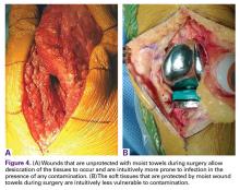 Moist wound towels sewn into the joint capsule protect the underlying soft tissues from debris and desiccation during the procedure and will intuitively lower the chance of wound infection from contamination and tissue injury (Figures 4A, 4B).