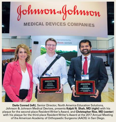 Darla Conrad (left), Senior Director, North America Education Solutions, Johnson & Johnson Medical Devices, presents Kalpit N. Shah, MD (right) with his plaque for the second-place Resident Writer’s Award, and Christopher Rice, MD (center) with his plaque for the third-place Resident Writer’s Award at the 2017 Annual Meeting of the American Academy of Orthopaedic Surgeons (AAOS) in San Diego.