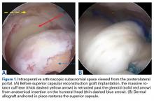 The surgical technique used here was described by Hirahara and Adams. 11 ArthroFlex dermal allograft was attached to the greater tuberosity and the glenoid, creating a superior restraint that replaced the anatomical superior capsule ( Figures 1A, 1B ). Some cases included biceps tenotomy, subscapularis repair, or infraspinatus repair.