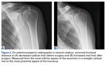 For all SCR patients, preoperative and postoperative radiographs were obtained in 2 planes: anterior-posterior with arm in neutral rotation, and scapular Y. On anteroposterior radiographs, AHD was measured from the most proximal aspect of the humeral head in a vertical line to the most inferior portion of the acromion ( Figures 2A, 2B ).
