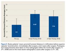 Only 1 patient had a failure that required RTSA. VAS pain scores were lower and ASES scores were improved the first year after surgery, but then function deteriorated. The patient said there was no specific precipitating incident. Computed tomography arthrogram, ordered to assess the construct, showed anterior and superior subluxation of the humeral head, even with an intact subscapularis tendon—an indication of underlying instability, which most likely caused the failure. Eighteen months after surgery, the patient was able to undergo RTSA. On further evaluation of this patient’s procedure, it was determined that the graft needed better fixation anteriorly.
