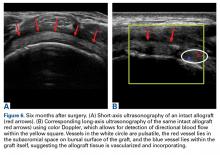 Two weeks to 2 months after surgery, all patients had an intact capsular graft and no pulsatile vessels on US. Between 4 months and 10 months, US showed the construct intact laterally in all cases, a pulsatile vessel in the graft at the tuberosity (evidence of blood flow) in 4 of 5 cases, and a pulsatile vessel hypertrophied in 2 cases ( Figures 6A, 6B ).