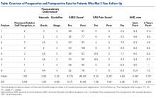 The Table provides an overview of the study results. Eight patients (6 men, 2 women) met the final inclusion criteria for postoperative ASES and VAS data analysis.