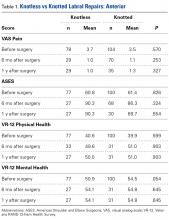 The major strength of this study was its large cohort and large population of surgeons. However, there were several study limitations. First, we could not detail specific repair techniques, such as simple or horizontal mattress orientation, and rehabilitation protocols and other variables are likely as well. Second, the repair technique was not randomized, and therefore there may have been a selection bias based on tissue quality. Although we cannot prove no bias, we think it was unlikely given that the groups were similar in age. Third, our data did not include information on range of motion or recurrent instability. Our goal was simply to evaluate PROMs among multiple surgeons using the 2 techniques. Fourth, there was substantial follow-up loss, which introduced potential selection bias. Last, there may have been conditions under which a hybrid technique with inferior knot tying, combined with a hybrid knotless construct, could have proved advantageous.