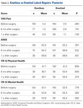 For the analysis, completely knotted and completely knotless techniques were compared for anterior repair, posterior repair, and SLAP repair. A t test was used to compare the techniques on PROMs, and χ2 test was used to evaluate proportion differences. Statistical significance was set at P < .05.