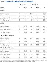 The goal of arthroscopic labral repair is to restore joint stability while maintaining range of motion. Arthroscopically repairing the labrum with suture anchors has become the standard technique, and several studies have reported satisfactory biomechanical and clinical results. 1,7-12 Surgeons traditionally have been required to tie knots for these anchors, but knot security varies significantly among experienced arthroscopic surgeons. 13 In addition, knots can migrate, 14 and bulky knots can cause chondral abrasion. 15,16 Several manufacturers have introduced knotless anchors for soft-tissue fixation. 15,17 The knotless technique provides a low-profile repair with potentially less operating time. 8 These factors may warrant switching from knotted to knotless techniques if outcomes are clinically acceptable. However, few studies have compared knotted and knotless techniques for glenohumeral labral repair. 8,15,18-21