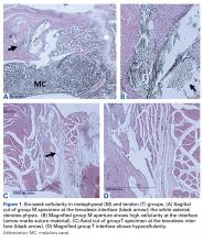 Four animals from each group were sacrificed at 6, 12, and 24 weeks. Harvested specimens were fixed in 10% neutral-buffered formalin solution. Bony specimens consisted of the upper half of the humerus and the tenodesed biceps tendon, and soft-tissue specimens consisted of the tenodesed LHBT-conjoint tendon complex. Bony specimens were decalcified in 10% ethylenediaminetetraacetic acid. All specimens were paraffin-embedded and sectioned at 7 microns.