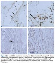 At 6 weeks, mean CD68 cell count was significantly higher in group M than in group D ( P = .011) and group T ( P < .001) ( Table 3B ). Likewise, CD68 count was significantly higher in group D than in group T ( P < .001). There were no differences in CD68 counts between the 2 bony tenodesis groups at 12 weeks ( P = .486) or 24 weeks ( P = .315). Both bony tenodesis groups, however, had persistently higher CD68 counts at 12 weeks when compared with group T (group M, P = .002; group D, P < .001). In these specimens, an inflammatory milieu characterized by a large accumulation of lymphocytes and giant cells was noted at the bone-tendon interface.