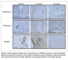 Results of the tenomodulin analysis suggested 2 different healing processes are occurring in the bony and tendon groups. Tenomodulin is a known tenocyte marker for developing and mature tendon in both rats and humans. 37,38 In our study, only group T had a positive tenomodulin reaction. Notably, the reaction occurred only at 6 and 12 weeks. This finding may indicate that a regenerative healing pattern becomes quiescent by 24 weeks. Indeed, it has been suggested that tenomodulin is a key regulator of tenocyte proliferation and tendon maturation. 39