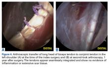 Group T had significantly lower cell and macrophage counts throughout the study period, possibly indicating improved healing—an observation supported by a study in which the impact of macrophage depletion on bone-tendon interface healing was evaluated. 29 The authors found that, in suppressing macrophage activity, the morphologic and biomechanical properties at the healing interface were significantly improved. 29 These findings are consistent with Dr. O’Brien’s anecdotal experience with patients who previously underwent the biceps transfer; on second-look arthroscopy, there was complete seamless integration of tendon and conjoint tendon ( Figure 4 ).