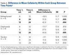 At the 6-week harvest, 1 group T specimen was sectioned incorrectly and discarded, leaving 3 specimens for evaluation. Descriptive statistics for each group and each time point are listed in Table 1A . There were no significant differences in mean cellularity between the bony tenodesis groups at any time point ( P = 1.000) ( Table 1B ). At 6 weeks, both group M ( P = .012) and group D ( P = .021) showed significantly more cellularity than group T ( Figure 1 ). The same was true for group M ( P = .002) and group D ( P = .001) at the 12-week harvest. There were no significant differences in cellularity between the 3 groups at 24 weeks.Within-group analysis revealed a trend of increasing cellularity at 12 weeks followed by a decrease at 24 weeks in all 3 groups ( Table 2 ).