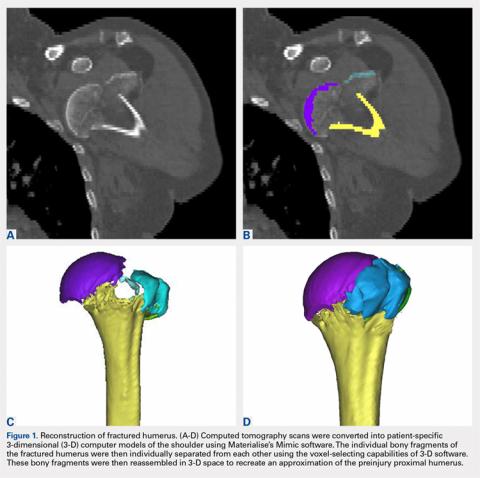 The CT scan protocol included 0.5-mm axial cuts with inclusion of the proximal humerus in the Digital Imaging and Communications in Medicine format. These CT scans were converted into patient-specific 3-D computer models of the shoulder using Mimics software (Materialise Inc.). The use of this software to produce anatomically accurate models has previously been verified in a shoulder model.6,7 The tuberosity fragments were then individually separated from each other using the voxel-selecting capabilities of 3-D software and manipulated with translation and rotation for anatomic reduction (Figures 1A-1D, Figure 2).