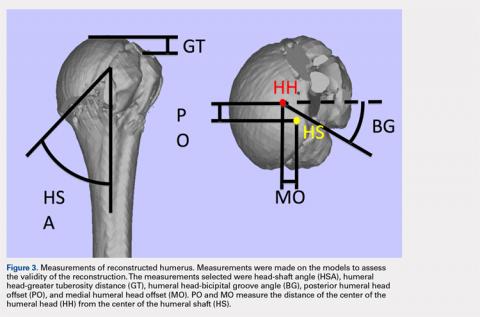 The origin was placed at the center of the best-fit sphere representing the humeral head. The y-axis was defined by the longitudinal axis of the humerus, and the x-axis was defined as the line bisecting the articular surface of the humeral head. This Cartesian coordinate system allowed us to manipulate the models in a standardized fashion, maintaining the exact positions of the humerus while making measurements.A series of measurements were made on these models to assess the validity and reliability of the reassembly. The bicipital groove at the anatomic neck was used to measure humeral head version as described by Kummer and colleagues.10 The head-shaft angle, humeral head-greater tuberosity distance, humeral head-bicipital groove angle, and posterior and medial humeral head offset were measured directly on the reconstructed humerus.