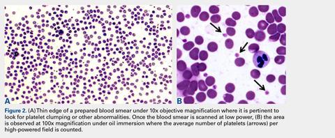 Automated complete blood counts were performed by a board certified clinical pathologist in the clinical pathology department of Cornell University on all blood, Llo PRP, and Lhi PRP samples. A manual platelet count, using a modified Giemsa stain,22 was performed on smears of all blood and PRP samples (Video). Slides were scanned at 10x magnification to identify an area where many red blood cells were present while maintaining a clear field of view (Figure 2A). The magnification was then increased to 100x using oil immersion, and the total number of platelets was counted in 10 fields of view (Figure 2B).