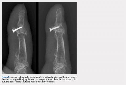 Transosseous tendon repair is a cost-effective option that obviates many complications commonly observed with other fixation methods. By keeping the suture within the body, the complications inherent in external sutures and buttons are eliminated, including the loss of fixation as a result of button or suture damage and facilitating hand hygiene maintenance. The rate of infection is also reduced. Moreover, the risk of nail deformities is decreased because the suture is not passed through the nail bed and nail plate in the described technique. Occasionally, some patients do note irritation from the dorsal suture knot under the thin skin proximal to the germinal matrix. This can be easily addressed in the clinic by removing the knot under local anesthesia following sufficient tendon healing. Additionally, the described technique can be used safely in pediatric patients with open physes because the needles can be placed to prevent violating the physis. This technique can be performed in conjunction with the skeletal fixation of type III, IV, and V jersey fingers. In our experience, the transosseous suture repair is more secure than the limited screw fixation, which can be accomplished in many type III jersey fingers, and in at least 1 case, has maintained flexor function when the skeletal fixation of the jersey finger has failed (Figures 5A, 5B).