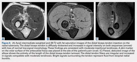 Partial distal bicep tears are characterized on MRI by focal or partial detachment of the tendon at the radial tuberosity with fluid filling the site of the tear. The degree of partial tearing can be assessed on MRI (Figures 5A, 5B).