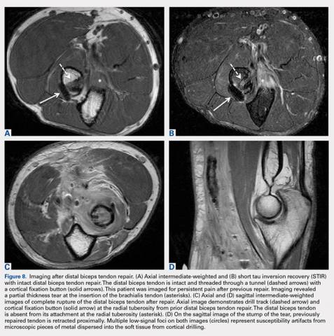 In distal biceps tendinosis, increased signals of thickened tendon fibers at the radial tuberosity are evident without focal discontinuity7,8 (Figures 6A-6C). Patients may display attenuation of the distal tendon fibers or adjacent fluid distension representing bicipitoradial bursitis (Figures 7A, 7B).MRI is useful in assessing the distal biceps tendon in the postoperative setting to evaluate the integrity of a repaired tendon. Cortical fixation button technique for repair creates minimal susceptibility artifacts on MRI. Postoperative MRI typically demonstrates a transverse hole drilled through the proximal radius at the site of the tuberosity with a cortical fixation button flush against the posterior radial cortex (Figures 8A-8D).