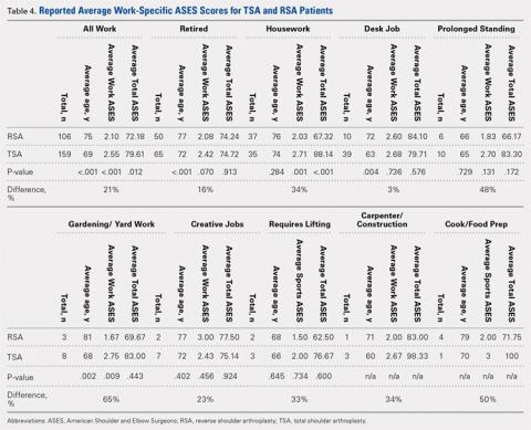 A total of 265 patients, including 106 RSA and 159 TSA patients, responded to question 10 of the ASES questionnaire. Among usually reported work, retirement (43%), housework (27%), and desk jobs (18%) were the most commonly cited. RSA patients denoting a work were significantly older than TSA patients (75 years vs 69 years, P < .001). Patients with TSA presented a 21% higher difference in the overall ability to work, featuring an average ASES work-specific score of 2.6 compared with the 2.1 for RSA patients (P < .001) (Table 4).