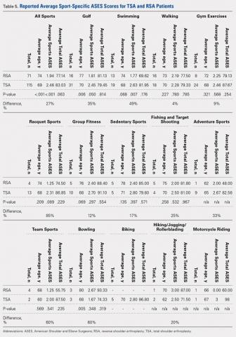 Among specific sports, TSA patients reported significantly higher scores for swimming (2.6 vs 1.8, P = .007) and golf (2.5 vs 1.8, P = .050). However, no significant differences were observed for walking, gym exercises, and racquet sports (Table 5). Among sport subsets, RSA patients were significantly older for golf (77 years vs 70 years, P = .006) and bowling (80 years vs 68 years, P = .005). Five TSA patients reported biking as their sport, whereas no RSA patient reported such activity. Within each subset of sports, no significant differences were noted in average ASES total scores.