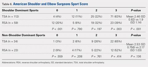 TSA patients demonstrated a more significant ability to perform usual sports that involve shoulder function without difficulty (score of 3). In shoulder dominant sports, a total of 63% of TSA patients reported a score of 3 compared with the 39% of RSA patients (P = .003). RSA patients more often reported an inability to perform shoulder specific sports, as proven by 20% of RSA patients reporting a score of 0 compared with 4% of TSA patients (P < .001) (Table 6).