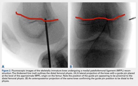 If a medial patellofemoral ligament (MPFL) reconstruction is considered in immature patients, careful consideration of the position of the MPFL in relation to the distal femoral physis is paramount. Shea and colleagues16 originally described the position of the MPFL, based on Schottle’s point17 on lateral radiographs, to be proximal to the distal femoral physis (Figure 2). However, due to the undulation of the physis, the lateral projection may falsely demonstrate Schottle’s point to be on or just proximal to the physis. Other researchers have evaluated the position of the distal femoral physis to be proximal to the origin of the MPFL by a range of 2.9 mm to 8.5 mm on AP radiograph and MRI, respectively.18,19 More recent cadaveric studies have demonstrated the origin of the MPFL in pediatric specimens in relation to the physis to be variable.20 Although we believe that a relative anatomic femoral position of the MPFL origin can be achieved without disrupting the physis using Schottle’s point, some have indicated concerns that this may produce a nonisometric position, which has not been our experience.21