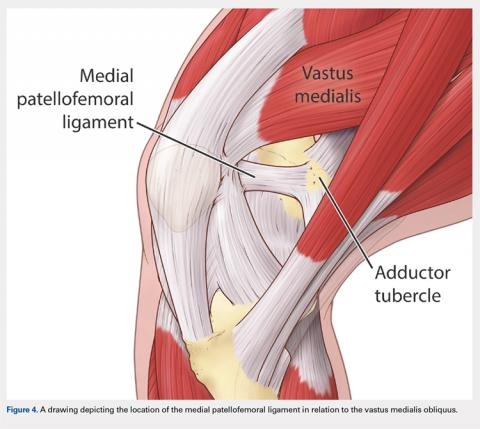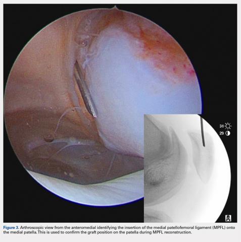 There are 3 methods to identify the insertion of the MPFL into the patella. During the diagnostic arthroscopy, an 18-gauge needle can be used to mark the insertion of the MPFL as visualization of the ligament arthroscopically is often possible (Figure 3). Another useful technique is to follow the inferior aspect of the distal insertion of the vastus medialis oblique (VMO) into the patella. The typical insertion point of the MPFL is immediately distal to the insertion of the inferior aspect of the VMO (Figure 4). It is also helpful to note that the center point of the insertion of the MPFL is at the junction of the proximal one-third and distal two-thirds of the palpable osseous patella. The MPFL origin has been noted to be at the exact midpoint of the chondral surface of the patella or 5 mm proximal (41% of the length of the patella) to the midpoint of the osseous patella.30