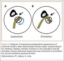 As the patient was physically active, operative treatment was chosen with the expectation of restoration to full function and strength. Six days after injury, surgery was performed using a 1-incision anterior approach with an Endobutton technique, as first described by Bain and colleagues6 and subsequently detailed by other authors.7 The diameter of the distal biceps tendon after attachment to the Endobutton (Arthrex, Naples, Florida) was measured, and a corresponding 7-mm unicortical tunnel was drilled into the radial tuberosity. During surgery, there was full range of motion (ROM) at the elbow and forearm. Before closure, the wound was copiously irrigated to minimize the potential of HO. In our practice, we do not routinely administer prophylactic anti-inflammatory drugs to low-risk patients because of the theoretical risks for delayed tendon–bone healing8 and inferior healing strength.9 The theoretical, expected postoperative appearance is illustrated in Figure 2.