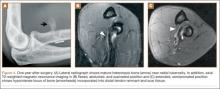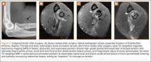 By 1-year follow-up, the patient had returned to preinjury activity levels, which included rock climbing and weightlifting without pain or loss of strength. One year after surgery, radiographs and MRI showed maturation of heterotopic bone, which was incorporated with scar tissue along the remodeled distal biceps tendon remnant (Figures 4A-4C).