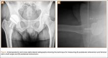 Radiographic assessment consisted of a low anteroposterior (AP) pelvic radiograph (with the radiographic beam centered on the pubic symphysis) and a cross-table lateral radiograph obtained at the most recent follow-up visit. Both the acetabular component abduction relative to the inter-teardrop line, and the angle between the femoral stem and the anatomic axis of the femoral shaft (stem-shaft angle) were measured on AP radiographs.19,20 Acetabular component anteversion was measured on the cross-table lateral radiographs as the angle between the projected long axis of the acetabular opening and a line drawn perpendicular to the long axis plane of the body (Figures A, B).21