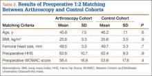 The same registry database was used to identify patients who received an HRA without a prior history of arthroscopy or hip surgery. A 1:2 matching analysis for those patients with a prior hip arthroscopy to those without a prior hip arthroscopy was performed to formulate a control group (control cohort) of 86 patients. Each patient in the arthroscopy cohort was matched with 2 patients in the control cohort based on the following parameters: age (± 6 years), sex (same), BMI (± 4 kg/m2), femoral head size (± 4 mm), and preoperative HHS and WOMAC scores (± 7 points). In the event an arthroscopy patient matched to 2 or more control patients, the patients who minimized the least squared error among the matching variables were selected.
