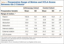 A comparison of the results of the 1:2 matching analysis between the arthroscopy and control cohorts is presented in Table 2. There was no significant difference in the preoperative age, BMI, femoral head size, HHS, or WOMAC score between the 2 cohorts. However, the control cohort did show a more severe, preoperative flexion contracture (as expressed by a decreased amount of extension) and a decreased amount of preoperative abduction (Table 3). The preoperative UCLA activity score was also decreased in the control cohort, but this was not statistically significant.
