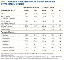 At 6-week follow-up, the arthroscopy cohort showed a significantly decreased WOMAC score compared with the control cohort (72.9 [SD, 15.5] vs 80.5 [SD, 11.8], respectively; P = .05). In addition, there was a trend towards a decreased SF-12 mental component score in the arthroscopy cohort (52.2 [SD, 9.3] vs 56.5 [SD, 7.8] in the control cohort; P = .06). However, none of the remaining clinical indices showed a significant difference between the 2 cohorts, and there was no difference in range of motion between the 2 cohorts at the 6-week follow-up visit (Table 4).