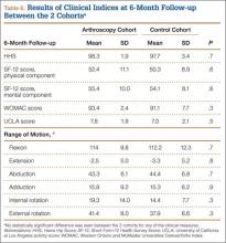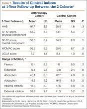 In addition, at 3-month follow-up, no statistically significant differences were seen between the 2 cohorts for any of the clinical indices or range of motion values. Both groups continued to improve rapidly, with HHS of 96.9 (SD, 3.5) in the arthroscopy cohort and 95.5 (SD, 6.6) in the control cohort, and WOMAC scores of 88.7 (SD, 10.2) and 89.5 (SD, 9.8), respectively (Table 5). Similarly, at the 6-month and 1-year follow-up intervals, the 2 cohorts showed continued improvement in their clinical measures, with no statistically significant differences between the 2 cohorts (Tables 6, 7).