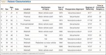 The 11 patients (6 men, 5 women) who met these criteria enrolled in the study. Mean age was 53 years (range, 43-68 years). Eight malunions involved the left tibia. The mechanisms of injury were motor vehicle crash (6 patients), fall from a great height (3), being struck by a motor vehicle (1), and gunshot (1). Mean time from injury to corrective surgery was 16.9 years (range, 1-34 years). Before surgery, each patient had a thorough physical examination, with plain radiographs, including anteroposterior (AP), lateral, and oblique views, obtained to assess degree of limb malalignment. Patients completed the Short Form-36 (SF-36) and the Musculoskeletal Function Assessment (MFA) and underwent joint kinematics and gait analysis. Five malunions were located in the mid-diaphysis of the tibia, 3 in the proximal third, and 2 in the distal third of the tibial shaft. One patient had posttraumatic deformity involving the proximal and the mid-diaphysis (Table 1). After surgery, each patient was followed at regular intervals in the surgeon’s private office. Minimum follow-up was 7 months (mean, 11 months; range 7-17 months). At follow-up, radiographs were obtained, and each patient completed the SF-36 and the MFA and underwent joint kinematics and gait analysis.