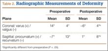 Several studies have identified a relationship between extent of tibial malalignment and changes in joint reaction forces.3,5-7,9-13 Puno and colleagues14 developed a mathematical model to better define the changes in neighboring joints relative to the pattern of the tibia malalignment. Not surprisingly, their work showed that, with distal tibial malunions, altered stress concentrations were realized at the ankle joint, and more proximal tibial deformities led to larger alterations in the joint stresses at the knee. More recently, van der Schoot and colleagues8 found a high prevalence of ipsilateral ankle osteoarthritis with tibial malalignment of 5° or more, and Greenwood and colleagues15 showed a higher incidence of knee pain, lower limb osteoarthritis, and disability in patients with previous tibia fractures. Given these findings, it would seem that correction of tibial malalignment would lead to normative lower extremity joint kinematic values, joint reaction forces, and overall quality of life (QOL).
