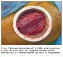 Experienced fellowship-trained orthopedic surgeons performed all procedures. A modified Hueter approach was used for exposure.9 Mean incision length was about 12 cm. For the treatment group, the ring retractor was inserted at the level of the tensor fascia, with the inferior ring resting between the fascia and the subcutaneous layer and the superior ring cinched over the skin (Figure 3). The device is made in 4 different sizes for incisions from 2.5 to 17 cm; our study population required only 1 size. Otherwise, the surgical protocol was based on that described by Matta and colleagues.8 Wound closure (over a drain) was performed according to a standardized protocol—running No. 1 Vicryl suture for the superficial tensor fascia, interrupted 2-0 Vicryl for the deep dermal layer, and subcutaneous 4-0 Monocryl for the skin followed by application of Dermabond (Ethicon, Somerville, New Jersey) and Tegaderm +Pad (3M, St. Paul, Minnesota) for outer dressing, which was replaced on postoperative day 2 and removed at the 2-week visit.