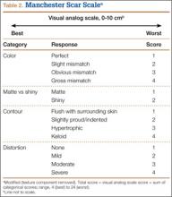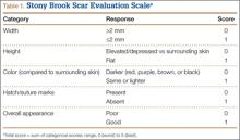 Photographs were evaluated by 2 blinded plastic surgeons (Dr. Friedman and Dr. Jack) using 2 grading systems—the Stony Brook Scar Evaluation Scale (SBSES)24 (Table 1) and a modified Manchester Scar Scale (MSS)25 (Table 2). We used these systems because they were photograph-based, psychometrically studied, and specifically designed to assess surgical incision healing with established validity and reliability.24-27 A particular advantage, strictly related to cosmetic outcome, is their validity in scoring scars from high-definition photographs in a different place or time. The SBSES, an ordinal wound evaluation scale that measures short-term cosmetic outcomes, consists of 6 items, each receiving 1 or 0 point, yielding a total score between 0 (worst) and 5 (best). The modified MSS includes a visual analog scale (VAS), which has a vertical hash marked on a 10-cm line and is scored between 0 (excellent) and 10 (poor) to 1 decimal point.26,28 This value is added to grades on color, surface appearance, contour, and distortion, resulting in a score between 4 (best) and 24 (worst). The primary outcome measures were Likert-scale responses obtained at final visit and SBSES/MSS scores for each visit; 12-week scores were the primary end point.