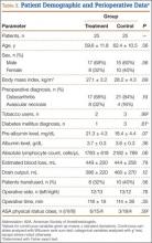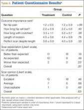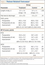 We found no differences in demographic or perioperative characteristics between treatment and control groups (Tables 3, 4). The groups showed similar mean improvements in their respective 6-week HHS (38.7 and 36.4 points; P = .65), SF-12 physical component summary scores (11.8 and 14.5 points; P = .37), and SF-12 mental component summary scores (5.1 and 3.7; P = .70).