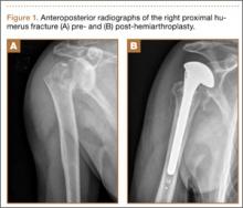 A previously healthy 50-year-old man presented to the emergency room in transfer from an outside hospital after a rollover motor vehicle collision in which he was ejected approximately 50 feet. Injuries included a right proximal humerus fracture/dislocation (Figure 1), right ulnar styloid fracture, L1 compression fracture, and multiple rib fractures. On admission, the patient had an ethanol level of 969 mg/L (.097%) and a urine drug screen positive only for opioids, presumably because of pain medication given that day. He denied a history of alcohol abuse and reported consuming 2 to 3 beers per week. The patient was awake, alert, and oriented with a Glasgow Coma Scale (GCS) of 15. He was tachycardic (heart rate, 126), tachypneic (respiratory rate, 24), and febrile (temperature, 38.6°C [101.5°F]), and his white blood cell count was elevated at 29.5×109/L. On examination, his right arm was found to be neurovascularly intact; it was placed in a sling with a forearm splint, and the patient was admitted to the intermediate special care unit on spine precautions with a plan for right shoulder hemiarthroplasty the following day.