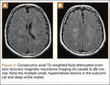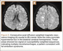 Overnight the patient’s mental status began to deteriorate, and approximately 10 hours after initial assessment, he was not answering questions but was able to respond to some commands. On hospital day 2, approximately 20 hours after initial assessment, the patient had a GCS of 8, was not responding to commands, and moved only in response to painful stimuli. The patient had been prescribed morphine by patient-controlled analgesia and had received intravenous hydromorphone on the day of admission, although the amount of medication delivered was not thought adequate to explain this deterioration. On the morning of hospital day 2, noncontrast brain computed tomography (CT) was normal with no evidence of intracranial hemorrhage or infarct. This was followed by brain magnetic resonance imaging (MRI), with the T2-weighted images showing numerous, small hyperintense lesions in subcortical and periventricular white matter, corpus callosum, basal ganglia, brain stem, and cerebellar hemispheres (Figure 2). The lesions also showed hyperintensity on diffusion-weighted MRI and were interpreted to be consistent with multiple, tiny infarcts (Figure 3). In addition, susceptibility-weighted sequences showed low signal in the same areas, suggesting multiple microhemorrhages, a pattern consistent with FES. Oxygen saturations remained 95% to 99%, and chest radiograph revealed clear lung fields without infiltrate. On hospital day 2, the patient was transferred to the intensive care unit and intubated for airway protection owing to an inability to clear secretions, although arterial blood gas levels remained normal. An echocardiogram revealed no right-to-left shunt, such as a patent foramen ovale (PFO); an electroencephalogram showed no seizure-like activity. No petechial rash was noted on skin examination. The patient was treated with supportive care. Right shoulder hemiarthroplasty was performed on hospital day 7 without complications (Figure 1). On hospital day 13, the patient was following commands and on day 14 he was extubated. His mental status continued to improve, and he was discharged to a rehabilitation facility after 36 days. On last follow-up, 6 months after initial injury, the patient was recovering well with no residual neurologic deficits and only minor limitation in range of motion of the right shoulder.