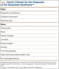 Fat embolism syndrome (FES) was first described by Von Bergmann in 1873 in a patient with a fractured femur.1 While fat within the circulation (fat embolism) is relatively common following long-bone fracture, the clinical pattern of symptoms that make up FES is less so, occurring in 1% to 3% of isolated long-bone fractures and 5% to 10% of patients with multiple skeletal trauma.1 A variety of clinical, laboratory, and imaging criteria has been described, classically by Gurd in 1970 (Table).1-6 Most commonly, however, it is a diagnosis of exclusion when the classic triad of respiratory difficulty, neurologic abnormalities, and a characteristic petechial rash are present in the appropriate clinical setting.6