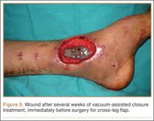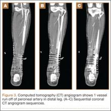 On postoperative day 17, the patient was found to have skin necrosis with exposed hardware over the medial laceration that had resulted from the open fracture (Figure 2). The wound measured 7×6 cm. The plastic surgery team was consulted, and a soft-tissue flap was recommended. Preoperative computed tomography angiogram (Figure 3) revealed 1 vessel runoff in the leg, constituting the peroneal artery, and a conventional angiogram confirmed this finding (Figure 4). Despite these findings, the patient was taken to the operating room 4 weeks after initial injury to try to find a vessel compatible with anastomosis. Intraoperative wound exploration confirmed no patent blood supply for local soft-tissue flap coverage. Therefore, the wound was irrigated and débrided, and a vacuum-assisted closure (VAC) dressing was applied despite exposed hardware and bone. A decision was then made to attempt a cross-leg flap as a salvage procedure, and VAC dressing therapy was continued for several weeks to prepare the recipient site (Figure 5).