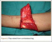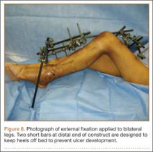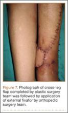 Seven weeks after injury, the patient was taken to the operating room by the orthopedic surgery and plastic surgery teams. After débridement, a fasciocutaneous flap was raised from the middle third of the contralateral leg (Figure 6) based on a posterior tibial artery perforator. The flap, which measured 7×7 cm (sufficient to cover the defect), was raised from lateral to medial from the posterior aspect of the leg with the pedicle located on the medial aspect of the right leg. Flap placement was facilitated by flexing the left knee to 80°. The flap was sutured into place with 4-0 Vicryl deep sutures followed by 4-0 nylon and superficial sutures in an interrupted fashion (Figure 7). Rigid external fixation was then applied to both extremities, bridging them together in optimal position (Figure 8). This construct included 2 short bars that would elevate the patient’s heels off the bed to reduce the chance of heel decubiti. Although including the feet in the external fixator construct may help prevent equinus contracture, we splinted the ankles in neutral position immediately after surgery so that we could begin early range-of-motion (ROM) exercises of the ankles to prevent stiffness. Ankle ROM exercises were started once the flap incorporated, 3 weeks after placement of the external fixator. Lacking medical insurance coverage, the patient could not be admitted to a rehabilitation facility or receive home care. He lived independently and had no help at home, so he had to remain hospitalized after placement of the external fixator. While hospitalized, the surgical site was treated with frequent dressing changes, including use of bacitracin and nonadherent dressing.