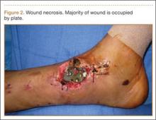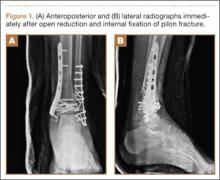 A 23-year-old man sustained a left grade III open pilon fracture after a fall off a cherry picker. He was initially treated with irrigation and débridement of the open anteromedial wound, wound closure, application of external fixation, and open reduction and internal fixation (ORIF) of the concomitant comminuted fibular fracture. Operative fixation of the pilon was performed 3 weeks after injury, once skin and soft tissues were in acceptable condition (Figure 1). Skin closure was performed with 2-0 Vicryl sutures (Ethicon, Inc, Somerville, New Jersey) followed by 3-0 nylon skin sutures and No. 2 nylon retention sutures to reduce tension at the incision.