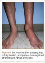 After flap coverage and 4 weeks of bed rest, a base clamping test confirmed the flap was incorporated into the recipient bed. The patient was then returned to the operating room for removal of the external fixator and skin grafting of the donor site. After surgery, he was started on physical therapy, including exercises for bilateral hip, knee, and ankle ROM and strengthening of the lower extremities. Four months after initial injury, the fracture was healed, based on bone consolidation, seen on radiographs, that is consistent with other pilon fractures treated at our institution. Six months after external fixator removal, the patient was able to ambulate independently with minimal discomfort (Figure 9). Passive and active ankle ROM was 20° of dorsiflexion and 25° of plantarflexion, compared with 25° of dorsiflexion and 45° of plantarflexion on the contralateral extremity. Subtalar motion had some stiffness with a 10° arc, compared with a 25° arc on the contralateral extremity. On simple manual testing, the patient had 5/5 motor strength with dorsiflexion, plantarflexion, inversion, and eversion. He returned to full duty as a landscaper about 1 year after initial injury and had no recurrence of wound complications or infection.