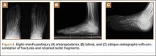 The patient was treated with supportive care and was discharged from the hospital in a comatose state on hospital day 17 to a rehabilitation facility. He began to emerge from the coma 6 weeks after injury, and his external fixator was removed and a cast applied to his lower extremity. His entrance and exit wounds healed as expected. Initial agitation was treated with propranolol and quetiapine. Because he continued to have difficulty with spasticity and increased tone, he was given botulinum toxin type A injections in the pectoral muscles, biceps, and forearms. He made continued and rapid improvement in response to intensive multidisciplinary therapy and returned home 4½ months after injury. Eight months after the injury, he is now walking independently with a cane and independent with his activities of daily living. Unfortunately, he has substantial pain in his foot, which appears to be a combination of both neuropathic and posttraumatic arthrosis causes. He is undergoing consultation for a possible amputation. Radiographs show consolidation of the hind and midfoot fractures with retained bullet fragments (Figures 6A-6C). He continues to receive multidisciplinary care to address cognitive limitations and is making progress.