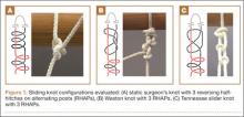 This investigation was conducted at the Orthopaedic Research Institute at Via Christi Health in Wichita, Kansas. The study compared 4 different suture materials tied with 3 different commonly used arthroscopic knots by 3 surgeons with different levels of experience. The 4 types of braided polyblend polyethylene sutures were Fiberwire (Arthrex, Naples, Florida), ForceFiber (Stryker, San Jose, California), Orthocord (DePuy-Mitek, Warsaw, Indiana), and Ultrabraid (Smith & Nephew, Memphis, Tennessee). Each suture material was tied with 3 arthroscopic knots—static surgeon’s knot, Weston knot,11 Tennessee slider12—and a series of 3 reversing half-hitches on alternating posts (RHAPs) (Figure 1). These knots were chosen based on studies showing they have a higher maximum force to failure when combined with 3 RHAPs.1,2,5,9,13-17