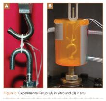 LTF testing was performed for both in vitro and in situ conditions using 10 samples of each suture–knot configuration for each mechanical testing. Each type of testing was conducted for a total of 240 suture–knot combinations per investigator. For the in vitro condition, each suture loop was initiated with 5 preconditioning loading cycles, from 6 N to 30 N at 1 Hz. The load was then applied continuously at a crosshead speed of 1 mm/s until “clinical failure” (3 mm crosshead displacement). We used this criterion for clinical failure, as studies have indicated that 3 mm is the point at which tissue apposition is lost.15,18-21 After the crosshead reached the 3-mm displacement, the loads (under load control) were held for 5 minutes at maximum load, and then load was applied continuously at a crosshead speed of 1 mm/s until complete structure failure. Load and displacement data were collected at a frequency of 20 Hz.