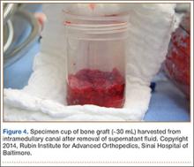 The RIA system is prepared on the back table by attaching the reaming head to the irrigation and suction systems. As the reamer head enters the intramedullary canal, an approach–withdraw–pause technique is used to slowly advance the reamer through the femur. It is crucial to use the image intensifier to guide reaming in order to avoid overdrilling the anterior cortex and prevent eccentric reaming of the canal, which more commonly occurs in patients with large anterior femoral bows.11 When the collection filter becomes full, reaming is stopped. The bone graft in the filter is emptied into a specimen cup for measurement and storage until subsequent use (Figure 4). Suctioning is suspended when reaming is stopped because substantial blood loss can occur with prolonged suction and aspiration.12 When repeat reaming is required, care is taken not to overream the cortices, thereby avoiding the risk of iatrogenic fracture.10,12