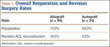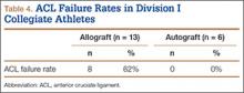 The study also included a subset of 19 primary ACL reconstructions (13 allograft, 6 autograft) performed on Division I athletes from the University of Arizona. (Nineteen [91%] of the 21 athletes in our Division I cohort were available for follow-up.) All these patients were younger than 25 years. All autograft reconstructions were performed with quadruple-stranded gracilis and semitendinosus tendons. ACL graft failure occurred in 8 (62%) of the 13 allograft cases; there were no failures in the autograft group (Table 4). One of the 5 allograft cases that did not fail required multiple surgical débridement procedures for infection, but the graft was ultimately retained. There were no infections among the 6 autograft cases.